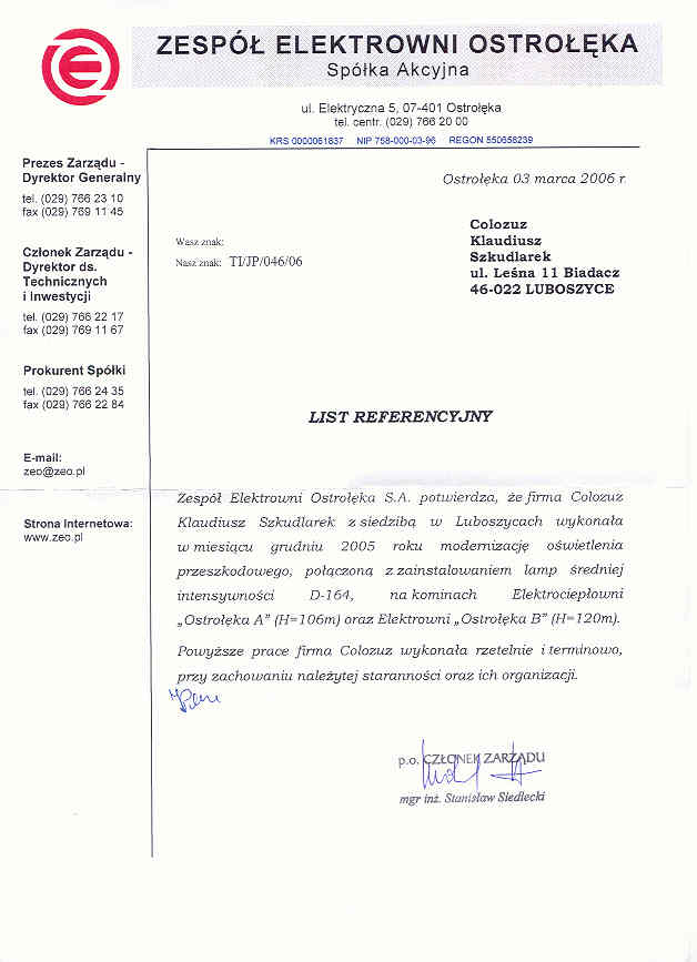 Referencje z wykonania prac montażu i uruchomienia oświetlenia przeszkodowego